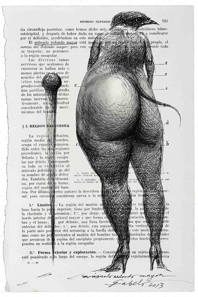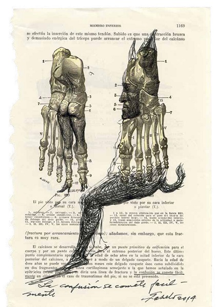 El resultado es sencillamente asombroso. En mi caso, dos tintas me parecen dignas de admiración y estudio: Músculo redondo mayor sobredimensiona la descripción anatómica original al punto que a partir de una sección del glúteo surge esa fusión de mujer, pájaro y cuadrúpedo que nos remite por analogía a los seres macondianos tan caros al pintor. Otra tinta,La confusión se comete fácilmente logra la fusión más completa entre el original y su recreación: de los huesos de las extremidades inferiores a la metáfora visual, el tránsito es orgánico y sorprendente.